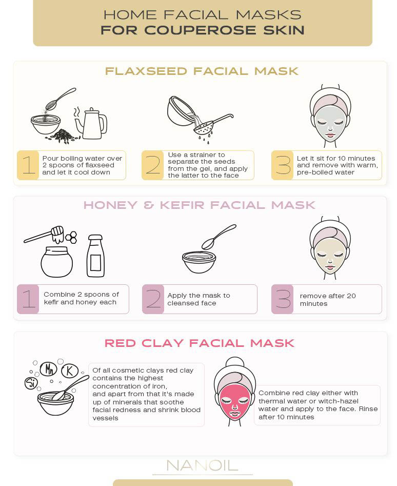 Bear in mind that even the most advanced aesthetic medicine treatments may not bring positive results if you don't follow the basic rules of proper couperose skin regimen. Mild skin care products and a face serum are essential. Additionally, using home facial masks to deal with spider veins shouldn be also considered as a crucial element of couperose skin care. Such products are gentle to skin, and therefore you can apply them even twice a week. Wiping sensitive skin with cucumber juice and chamomile infusion is also recommended.